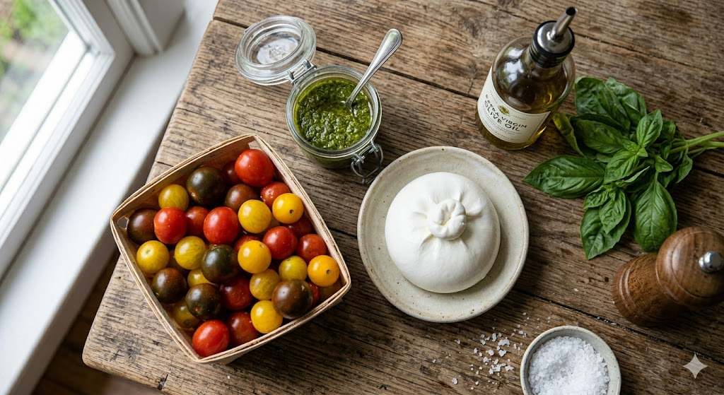 La ensalada de burrata se ha convertido en el plato estrella de los restaurantes de moda, pero hacerla en casa con un resultado profesional es mucho más sencillo de lo que parece. La clave no está en cocinar, sino en la selección y el tratamiento de los ingredientes. En esta guía completa, te enseñamos a preparar la combinación definitiva: burrata, tomates cherry caramelizados y pesto de albahaca fresca.