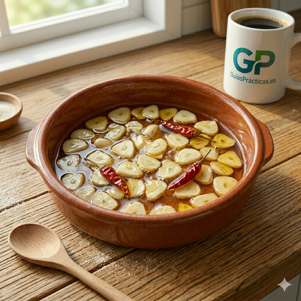 ¿Puedo usar gambas congeladas? Sí, pero el truco de Guías Prácticas es descongelarlas totalmente sobre papel de cocina. Si sueltan agua en el aceite, las gambas se «cocerán» y el aceite no emulsionará, perdiendo esa textura untuosa tan característica.