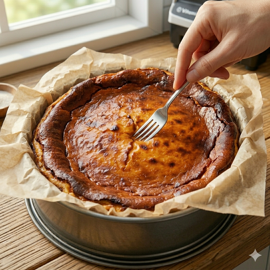 - Paso 4 (El Punto ‘Jiggle’): Al sacar la tarta del horno, el centro debe moverse como un flan (el famoso jiggle). No te asustes si parece cruda; se terminará de cuajar con el calor residual del horneado.