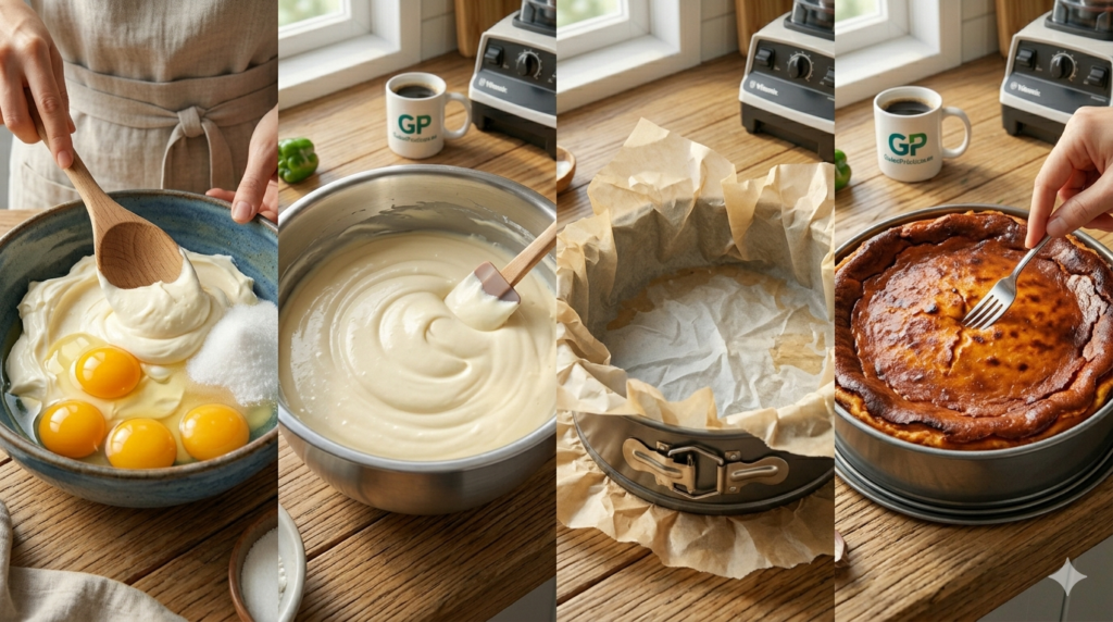 Consejo de Guías Prácticas: Si usas batidora eléctrica, hazlo a la velocidad mínima. El aire es el enemigo de esta tarta: si la masa se llena de burbujas, subirá mucho en el horno (como un suflé) y al sacarla se hundirá drásticamente, creando una textura esponjosa en lugar de la cremosa original.